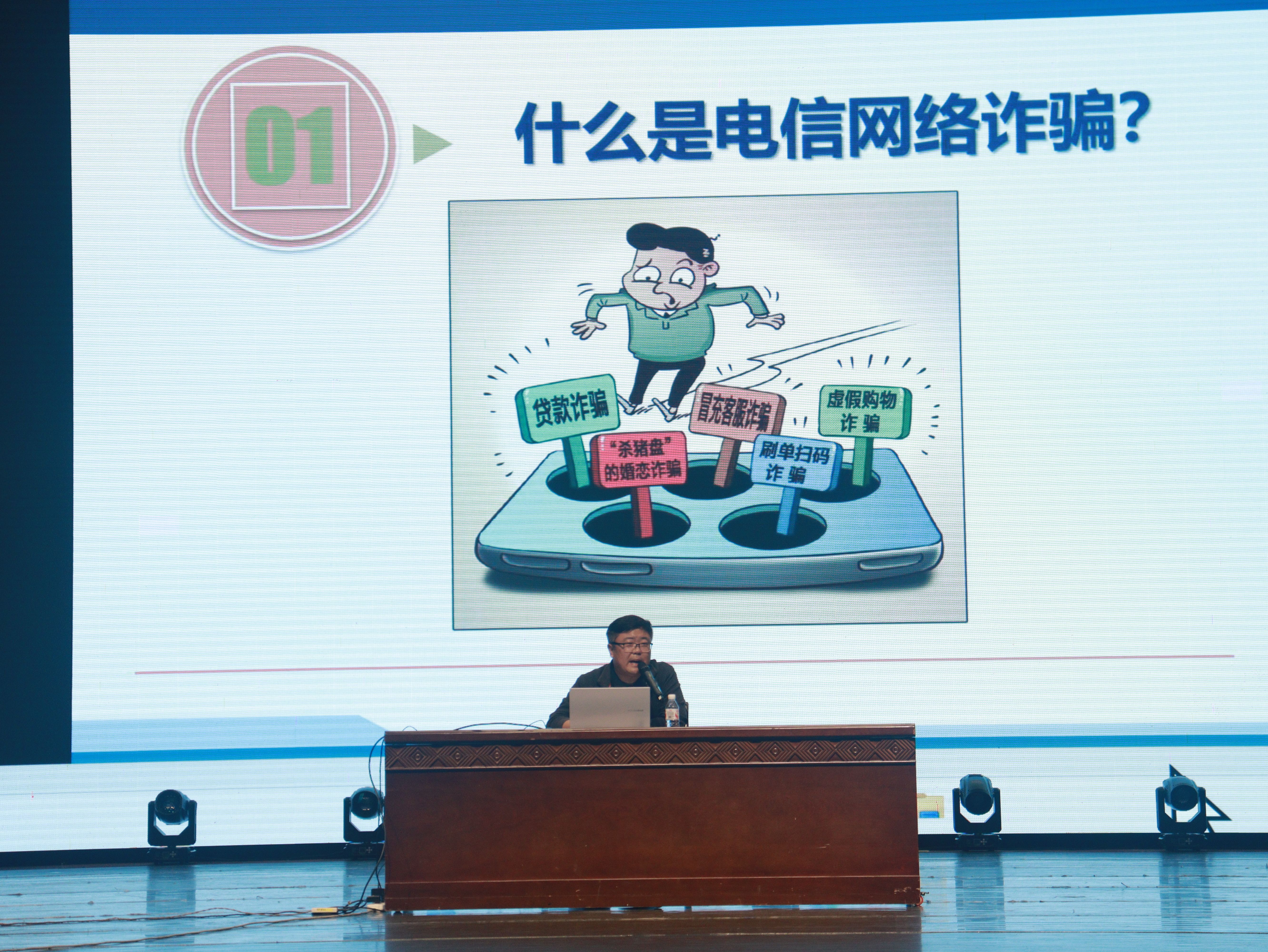 宣讲中,金中州同志以“防范电信网络诈骗,共同守护平安校园”为主题,围绕电信网络诈骗的定义、校园常见诈骗类型、防范常识及“断卡”行动四个方面展开讲解。他结合冒充身份、刷单返利、虚假论文发表、虚假购物等十余起校园真实案例,深入剖析诈骗分子的作案手法和套路,帮助学生认清电信诈骗的隐蔽性与危害性。