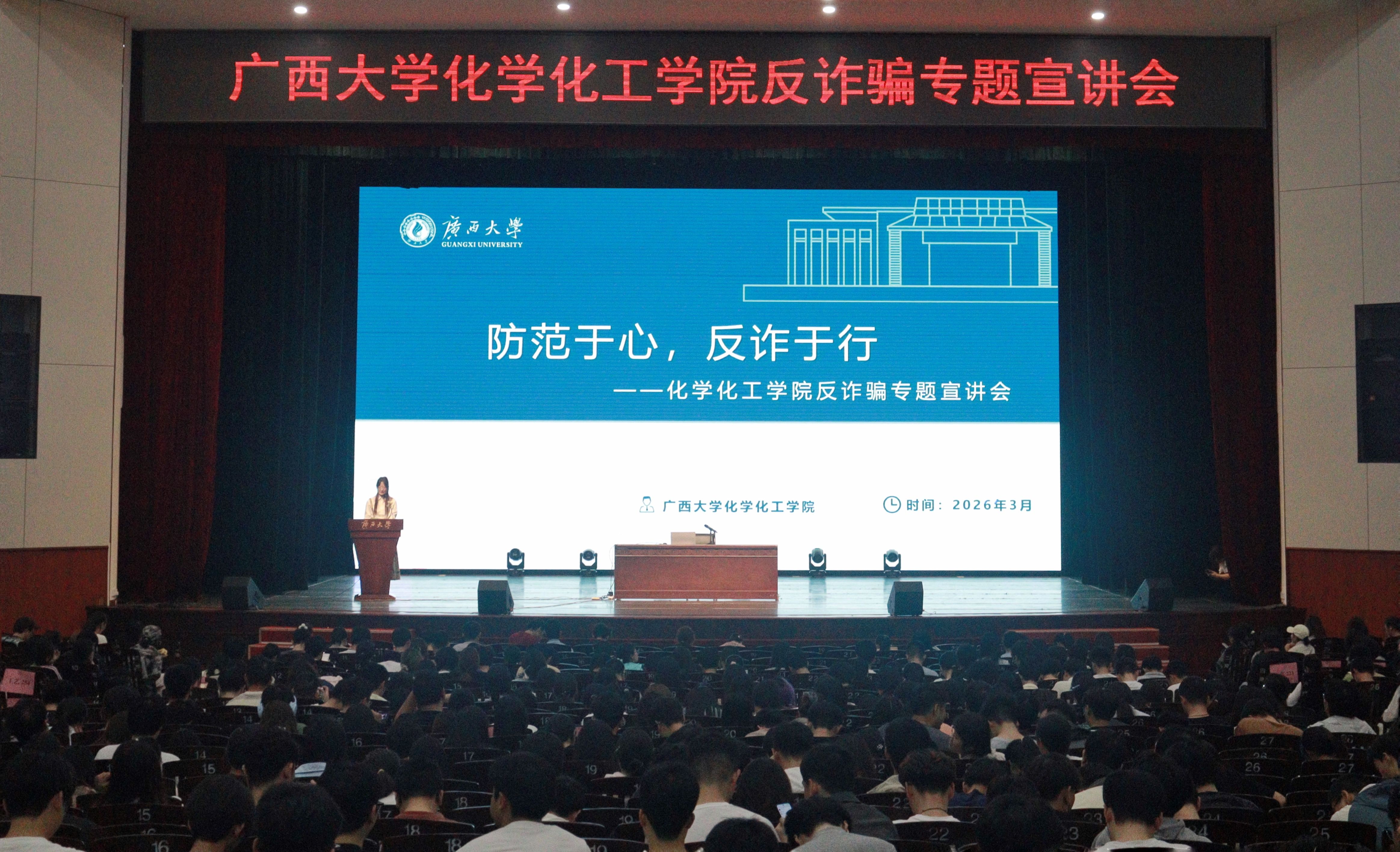 为切实提升学生防范电信网络诈骗的意识和能力,筑牢校园安全防线,3月18日晚,我院在广西大学大礼堂分两场举行反诈骗专题宣讲会。学院党委副书记、纪委书记徐丽,各年级辅导员,全体本科生、硕博研究生及学生工作组人员参加活动。保卫处金中州同志应邀担任主讲,超过2700名学生到场聆听。