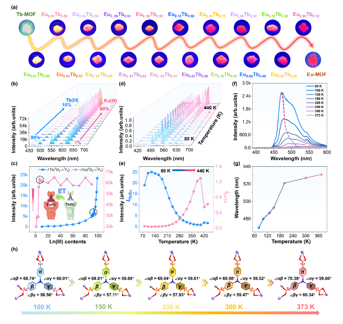 该团队创新性地利用动态的分子转子,首次构建了具有自适应天线效应的智能稀土金属有机框架发射体,并精准调控了能量转移途径,实现了高效的智能发光切换行为、上转化发光和多重智能防伪等应用。具体而言,错位且反向平行的分子转子配体与单核的次级构建单元交错连接,形成了在强酸和强碱水溶液中均具有高稳定性的层状的Ln-MOFs,能够通过温度调节有效控制分子转子的运动或者扭曲程度,激活动态变化的天线效应匹配不同的稀土离子,进而实现可循环的发光切换行为及复杂的多重加密防伪技术。此外,由于分子转子配体与Eu(III)离子高度匹配的能级水平,仅含有1%的Eu(III)的Gd0.99Eu0.01-MOF就能够显示出明亮的红色发光,并且在Eu(III)含量为1% ~ 9%的范围内,Eu(III)离子的特征发射强度与含量呈现出了斜率k高达2298.7的优异线性关系,为甄别不同厂家钆盐中极低含量的Eu(III)离子杂质提供了有效手段。