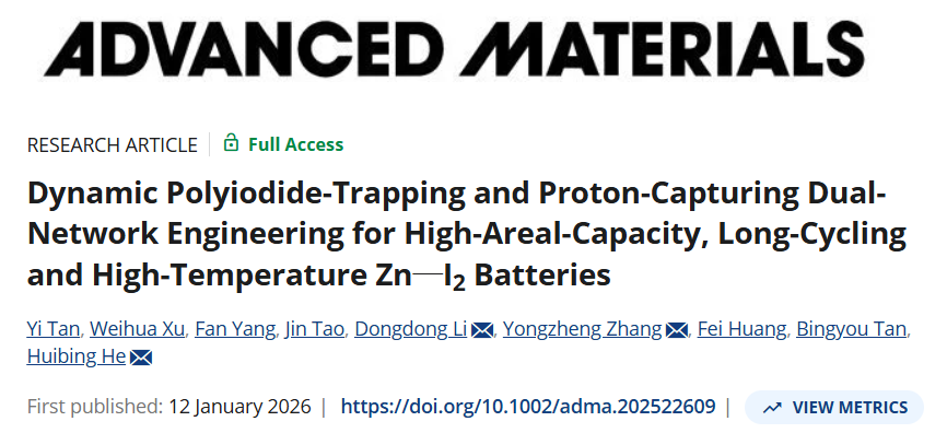 近日,我院科研团队在水系锌电池研究领域取得新进展。研究成果以“Dynamic Polyiodide-Trapping and Proton-Capturing Dual-Network Engineering for High-Areal-Capacity, Long-Cycling and High-Temperature Zn─I2 Batteries”为题,发表于Advanced Materials。广西大学化学化工学院2023级硕士生谭祎为第一作者,广西大学化学化工学院副教授何会兵、助理教授李冬冬,南通大学副教授张永正为共同通讯作者,广西大学是第一通讯单位。