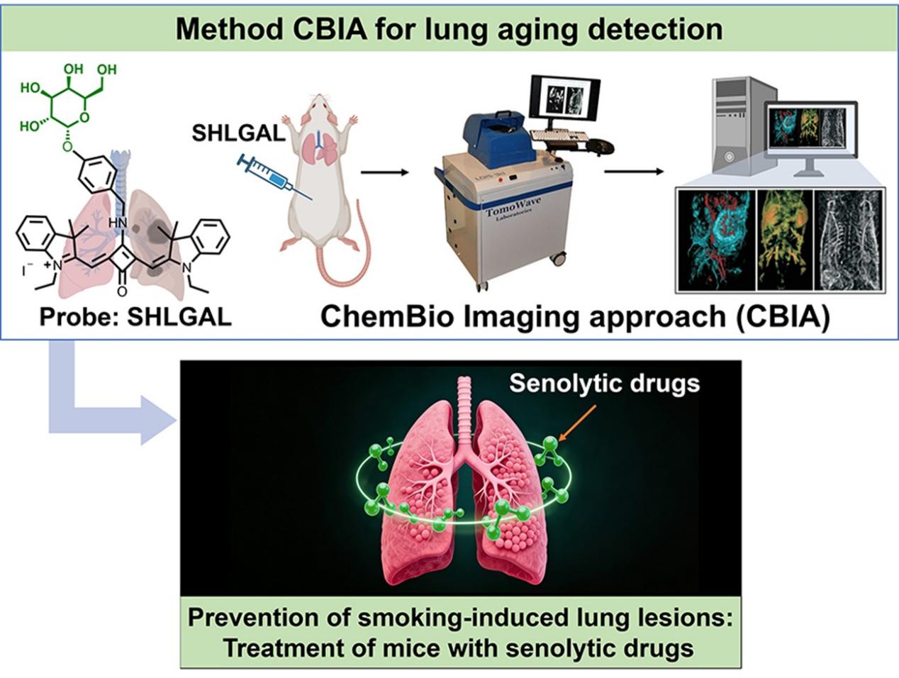 针对这一难题,该研究团队设计合成了新型光声探针SHLGAL,首次实现了活体水平上的肺衰老检测。实验表明,该探针能有效响应衰老标志物β-半乳糖苷酶,在体外和体内均表现出良好的检测性能。在此基础上,团队将SHLGAL与光声成像结合,建立了操作简便的非侵入性的活体检测方法——ChemBio Imaging Approach (CBIA)。应用CBIA,团队成功监测到吸烟诱导的肺衰老过程,并首次发现达沙替尼和槲皮素对吸烟引起的肺损伤具有潜在预防作用,为疾病早期干预提供了新思路。该研究不仅为肺衰老的活体检测提供了创新性技术路径,也为新型功能性探针的设计与应用奠定了基础,展现出在化学、生物医学等交叉领域的广阔应用前景。