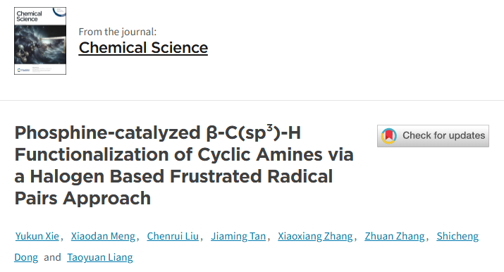 近日,我院梁桃源副教授研究团队在绿色有机合成与催化领域取得了新的进展,相关研究工作为受阻自由基对化学的发展提供了全新的思路。该成果以“基于卤素介导的受阻自由基对策略实现膦催化环胺β-C(sp³)–H键的官能化反应”(“Phosphine-catalyzed β-C(sp³)–H Functionalization of Cyclic Amines via a Halogen Based Frustrated Radical Pairs Approach”)为题发表在国际知名期刊Chemical Science,广西大学为唯一通讯单位。